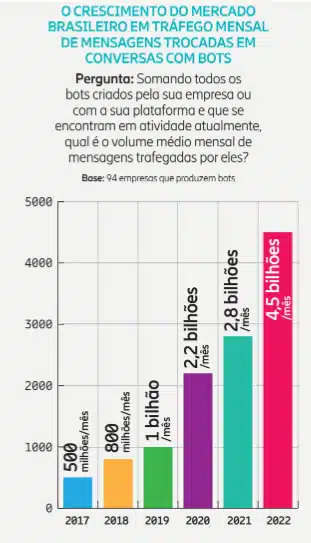 O levantamento também destaca que cada um dos robôs em atividade troca em média 78 mil mensagens por mês, indicando um aumento na interação dos usuários brasileiros com os chatbots, como pode ser observado no seguinte gráfico: